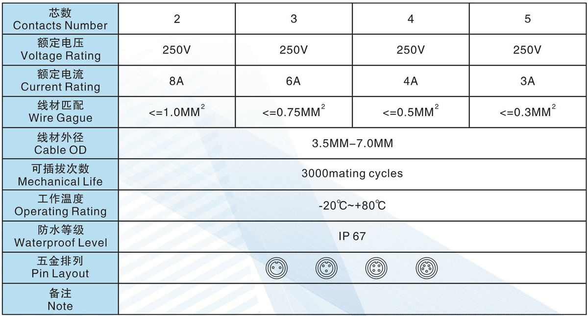 芯數(Contacts  Number):   2 - 5 芯