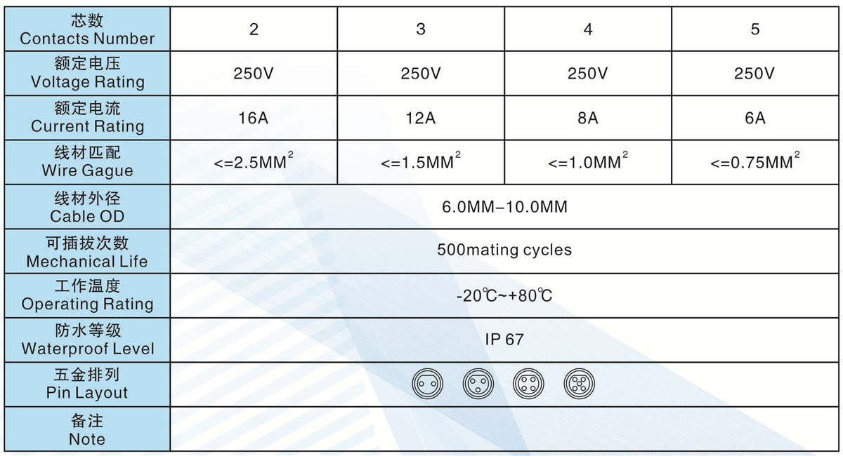 芯數(Contacts  Number):   2 - 5 芯